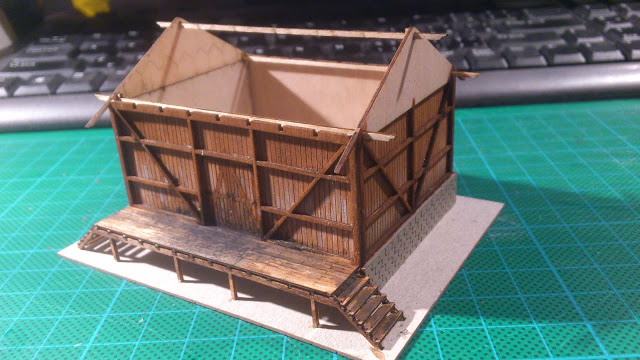 Patinace stěn - opršení prken a zašpinění od uhlí. Návod ve stavebnici zmiňuje obvyklý tmavý konzervační nátěr, ale v tomhle případě jsem si trochu zaimprovizoval, protože si skladiště představuji spíš jako stavbu z nepříliš udržovaných prken... možná už neudržovaný nátěr oprýskal... možná tu s natíráním byli nedůslední... a nebo nátěr ještě neprovedli.